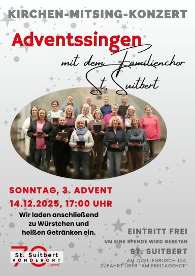 Jedes Jahr lädt der Familienchor St. Suitbert zu diesem Mitsing-Konzert in die wunderschön illuminierte Kirche ein. Eine Mischung aus traditionellen Liedern und neuen modernen Adventsliedern bringt die ganze Kirche zum Singen. Viele glückliche Gesichter haben sich verzaubern und in eine tolle Stimmung bringen lassen.